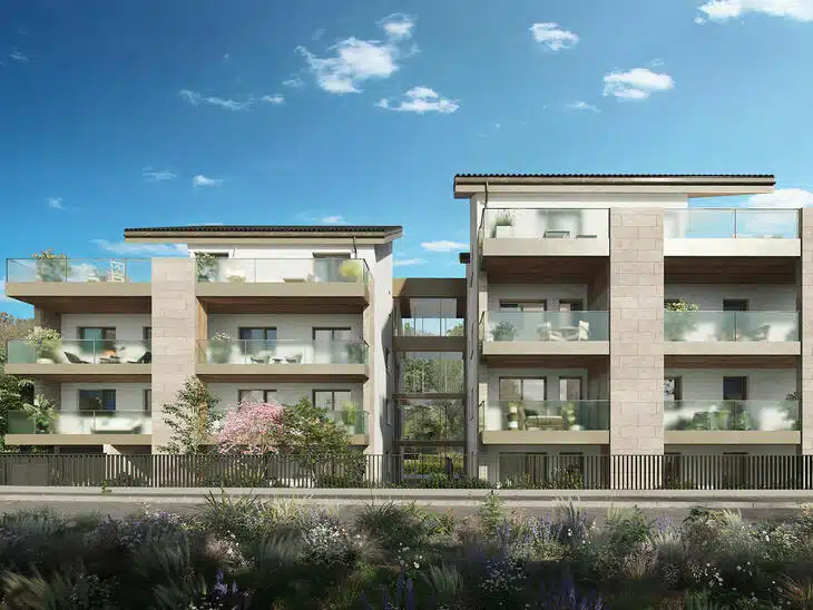 Avec ses toitures à deux pans, le bois utilisé en fonds de loggias, les menuiseries en aluminium et ses pierres de parement sur un enduit clair, l’élégance de l’ensemble est indéniable. Elle est renforcée par des garde-corps en verre granité qui garantissent la luminosité dans les logements.