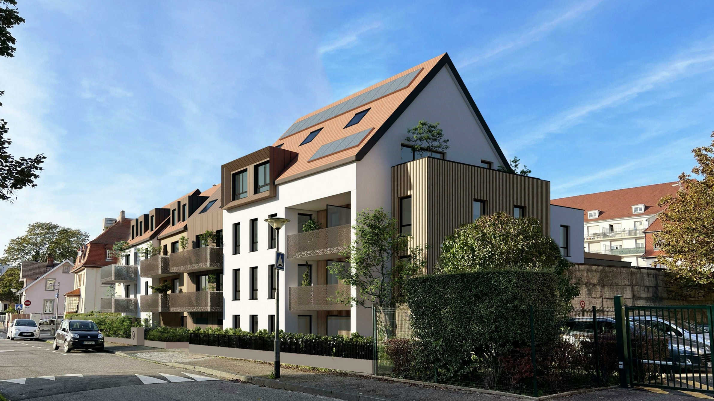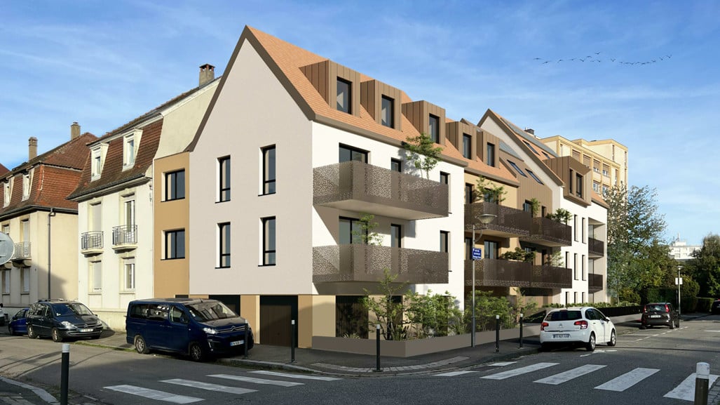 Nichée dans une rue paisible du Neudorf, la résidence conjugue harmonieusement sérénité et vie urbaine. Son architecture contemporaine s’intègre avec élégance dans le tissu résidentiel environnant grâce à ses volumes à taille humaine et ses teintes douces allant du blanc cassé à l’ocre et au brun.