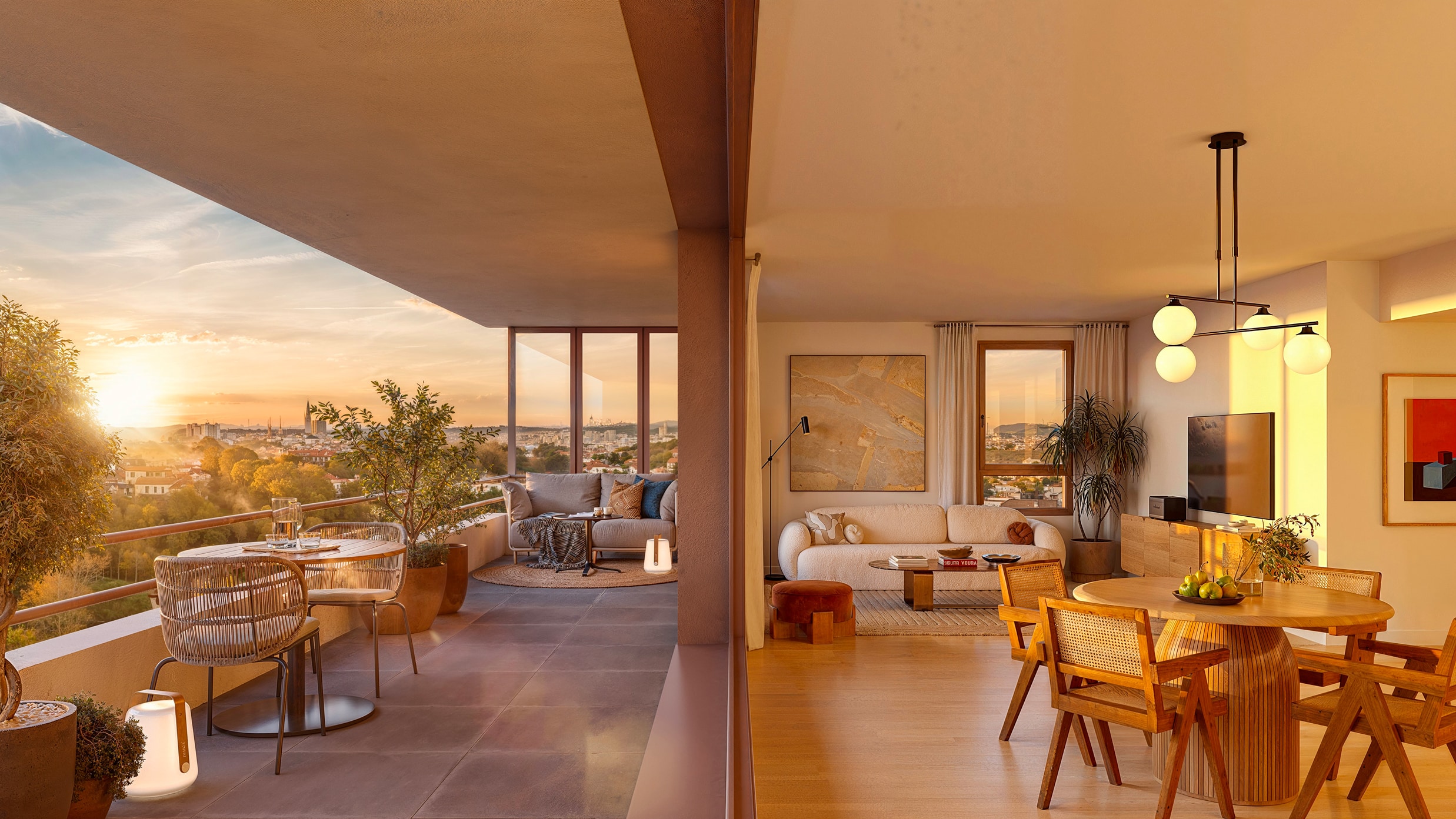 Les espaces extérieurs ont été pensés comme de véritables lieux de détente : coeur d’îlot paysager, allées arborées, haies fleuries et coins de repos invitent à la sérénité. Les balcons, loggias et terrasses prolongent les intérieurs et offrent une vue dégagée sur les jardins, permettant de savourer pleinement chaque saison.